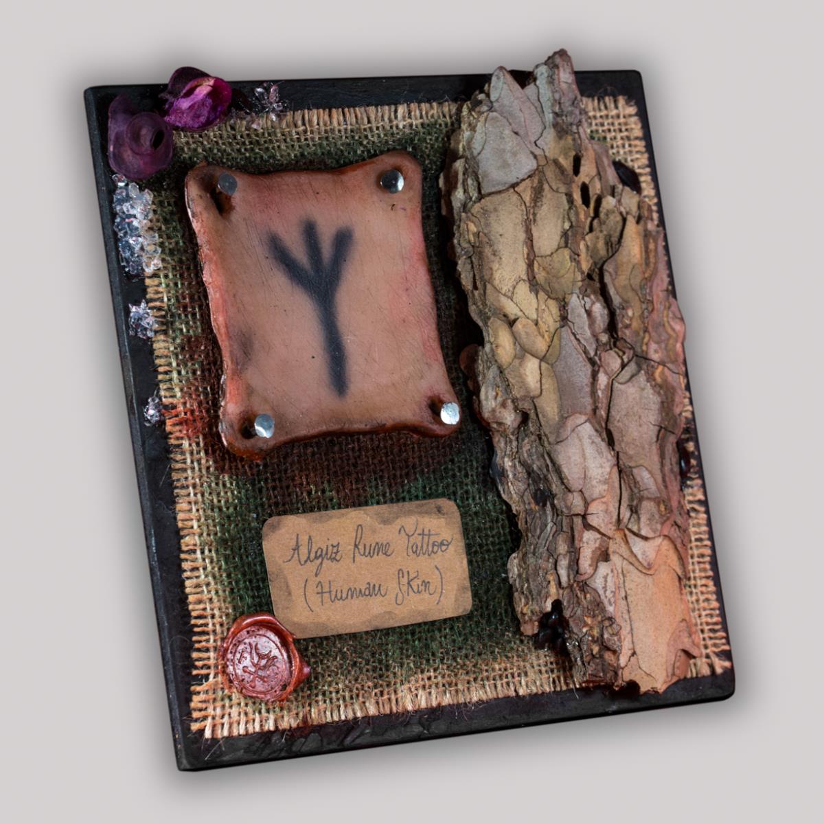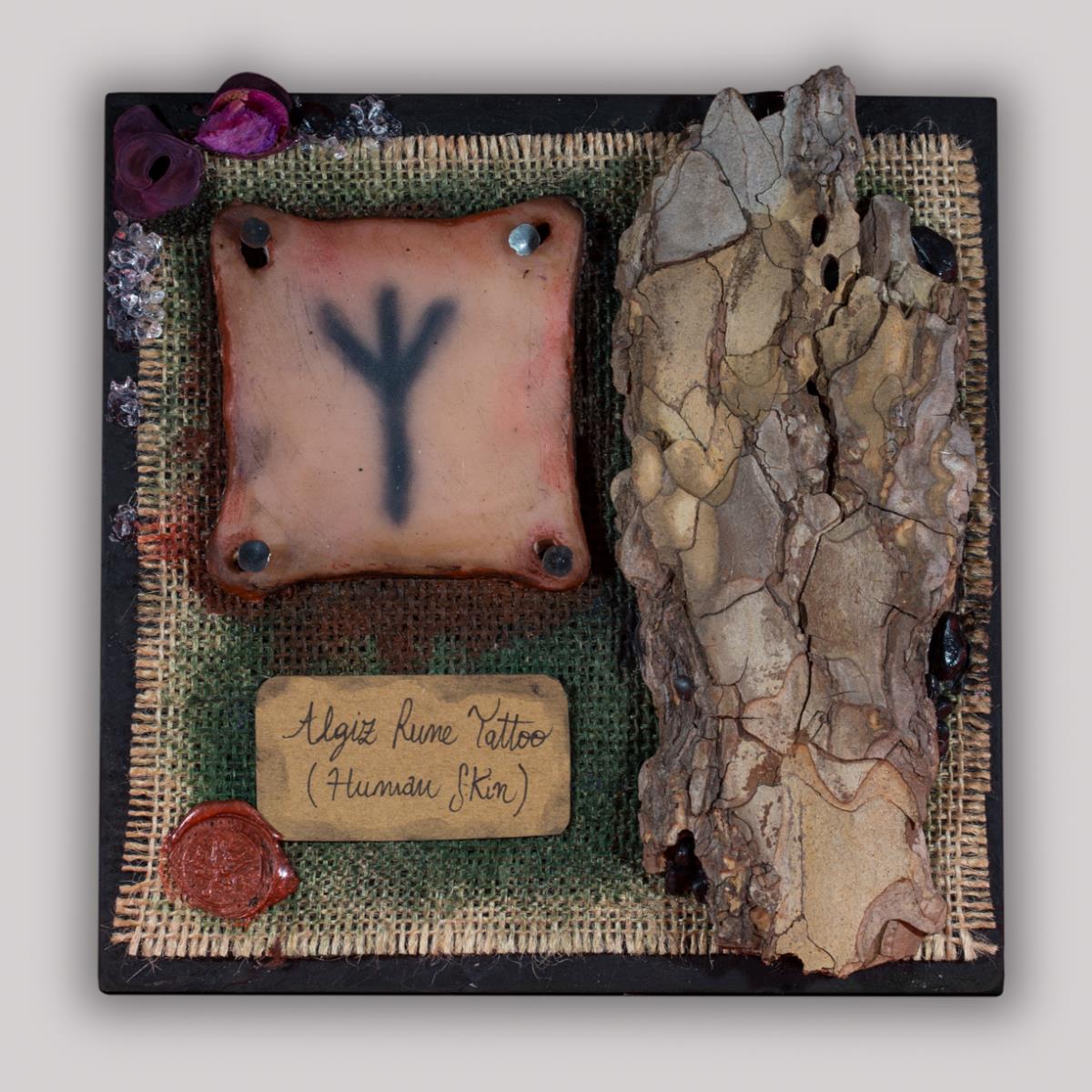 - Formato e dimensione: 18CM X 18CM - Tipo supporto: Pelle umana sintetica iper realistica (by Crisiplastica) - Tatuato a mano - Artista: Frida Ghiozzi - Titolo: Algiz - Cornice: Legno - Su ogni quadro/oggetto è presente un’etichetta che indica titolo, data e artista dal quale è stata creata.