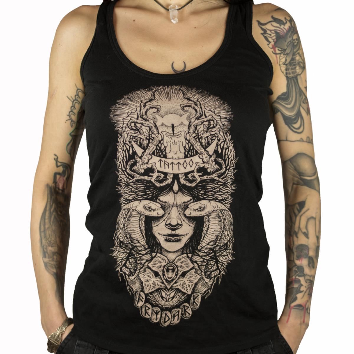 Canottiera FIT modello DONNA, in cotone 100% 120 gr/m2, colore nero, decorata con stampa serigrafica artigianale bianca/avorio. Massima durabilità e resistenza al lavaggio. Ottima vestibilità