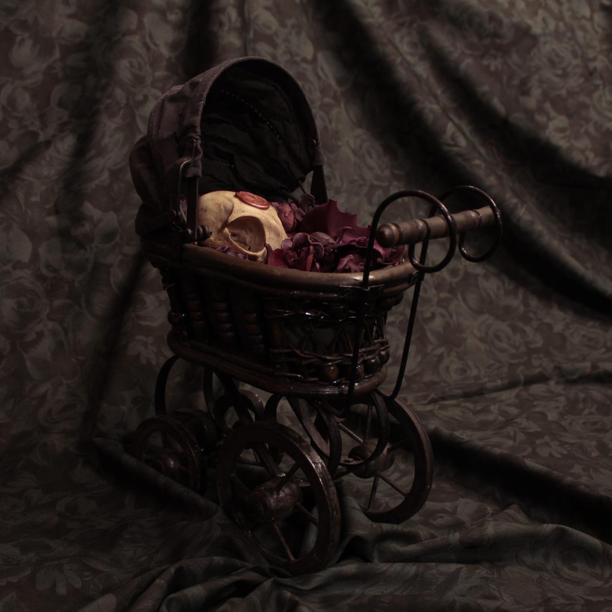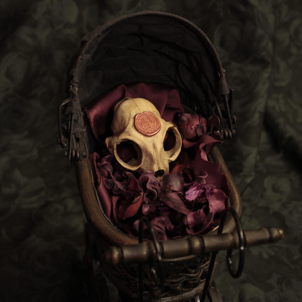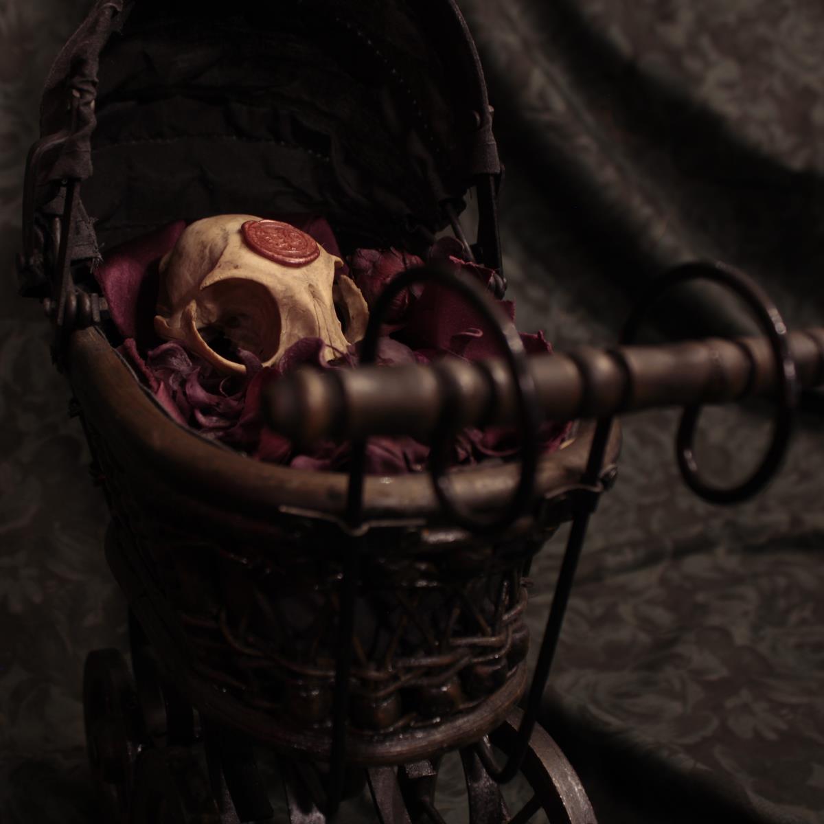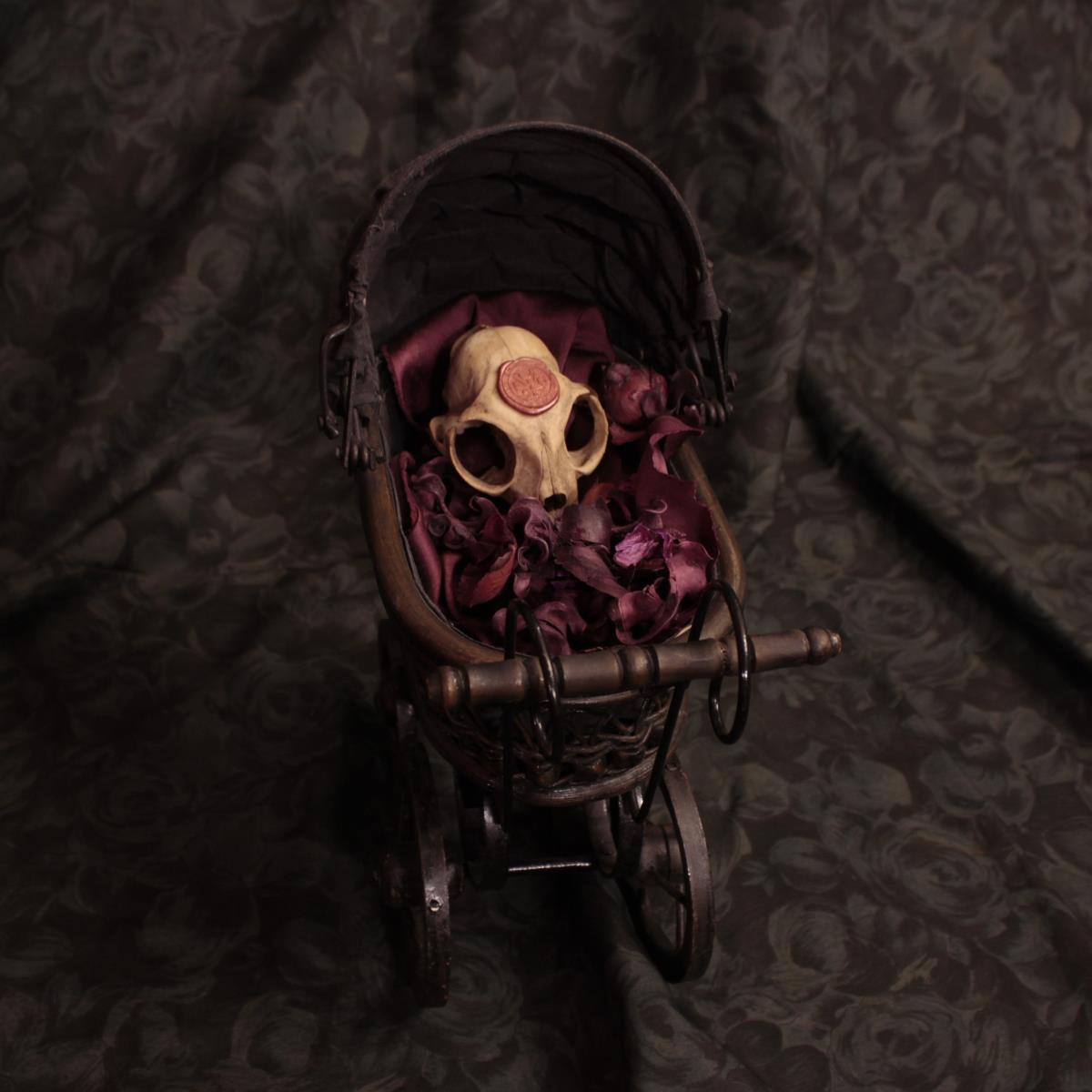 Carrozzina in legno e tessuto contenente un teschio di gatto, decorata con fiori secchi profumati.