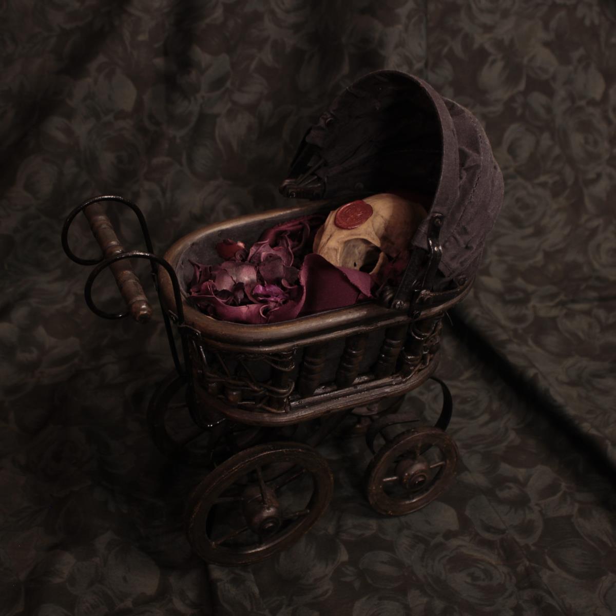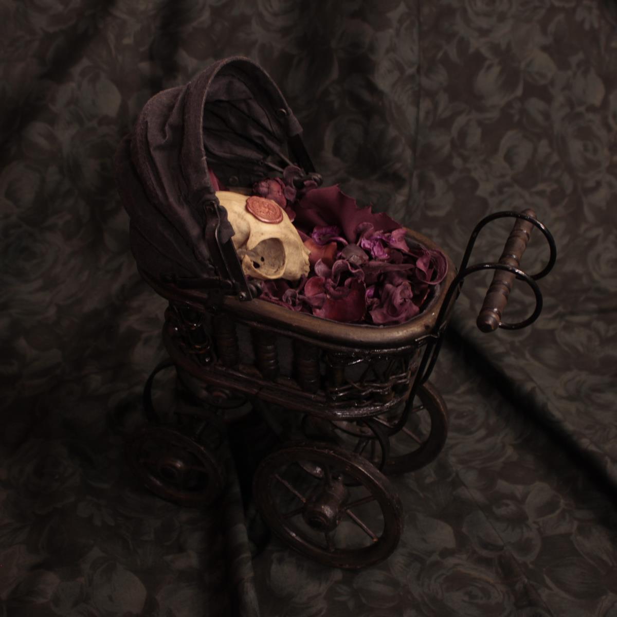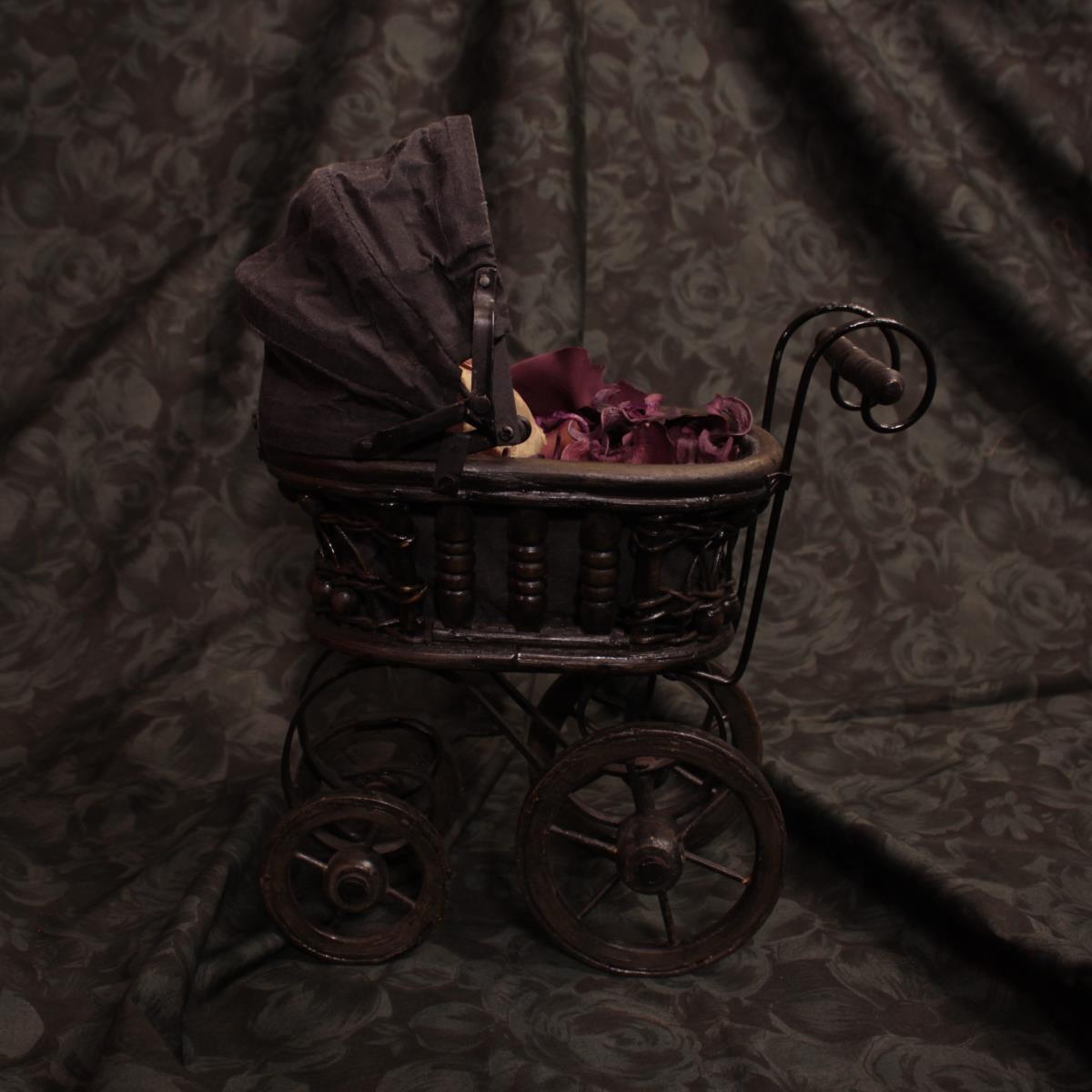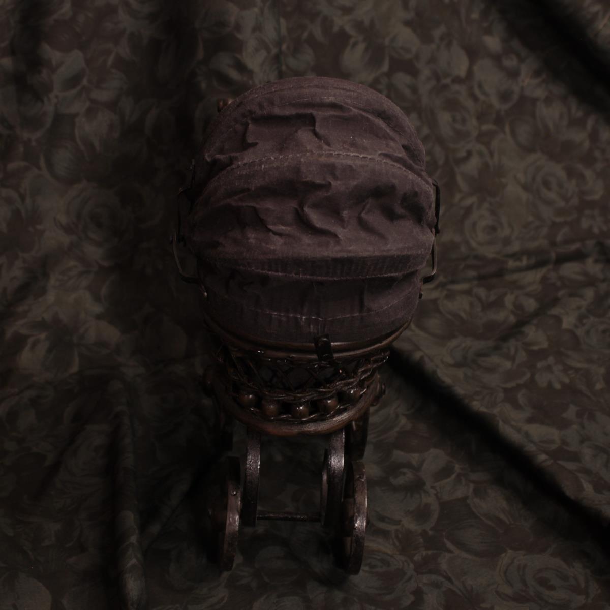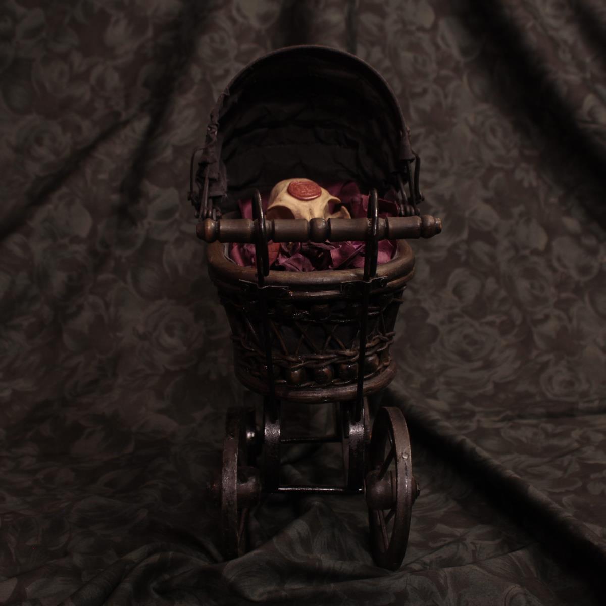 - Materiale: Carrozzina antica in miniatura in legno e tessuto con teschio di gatto