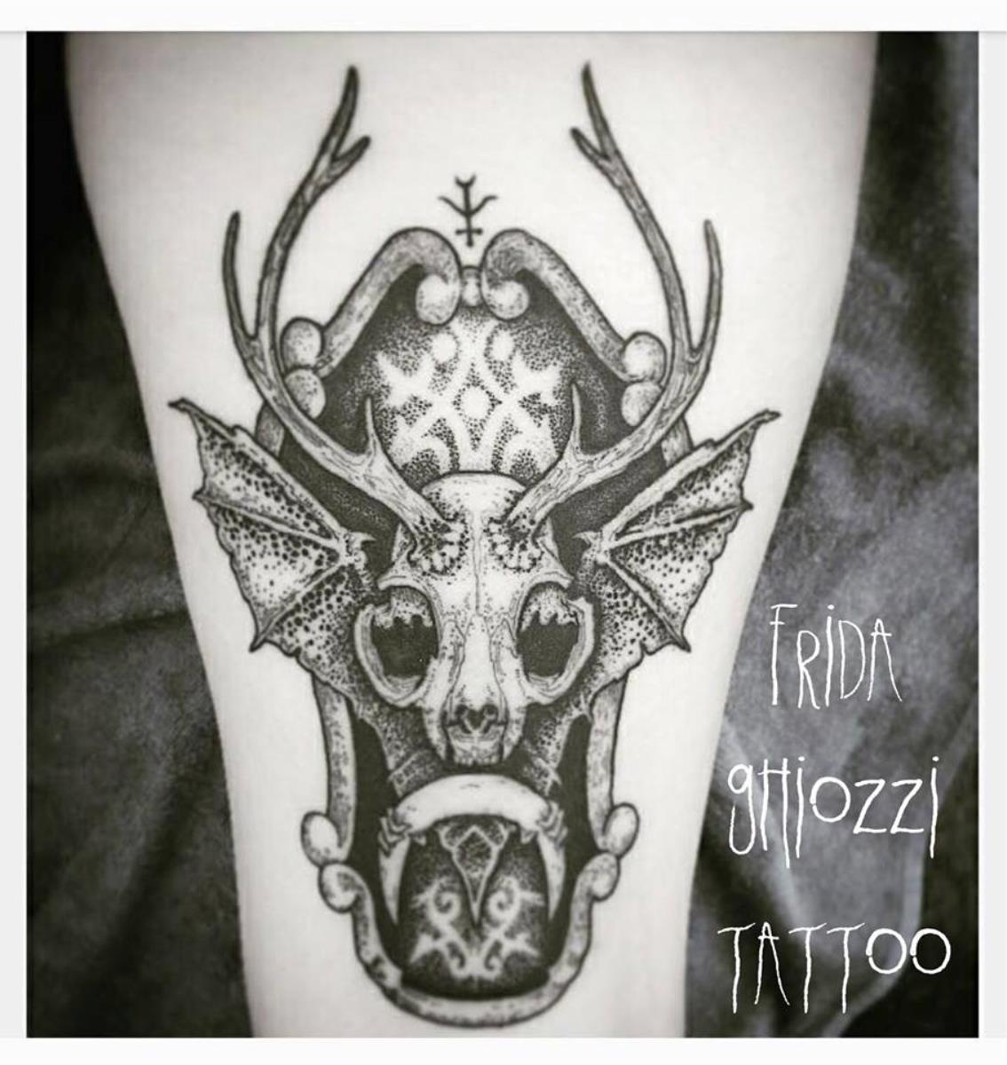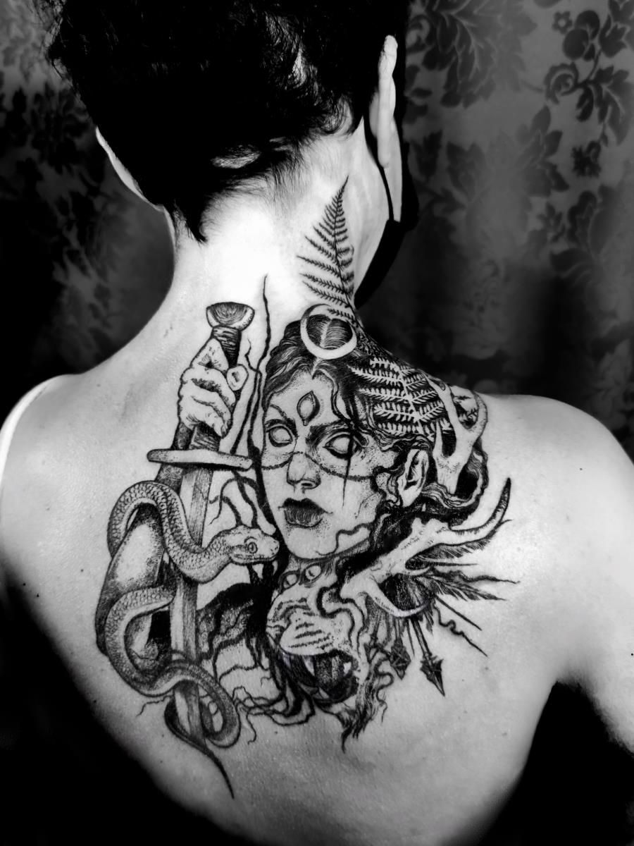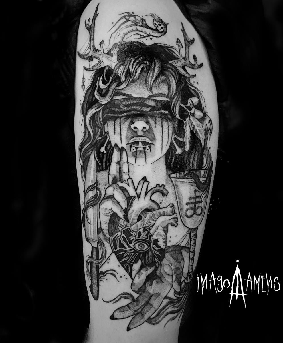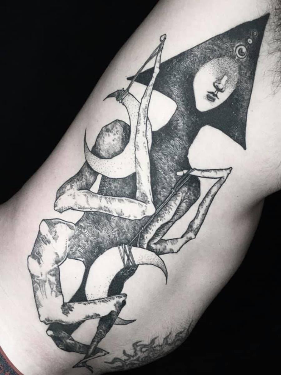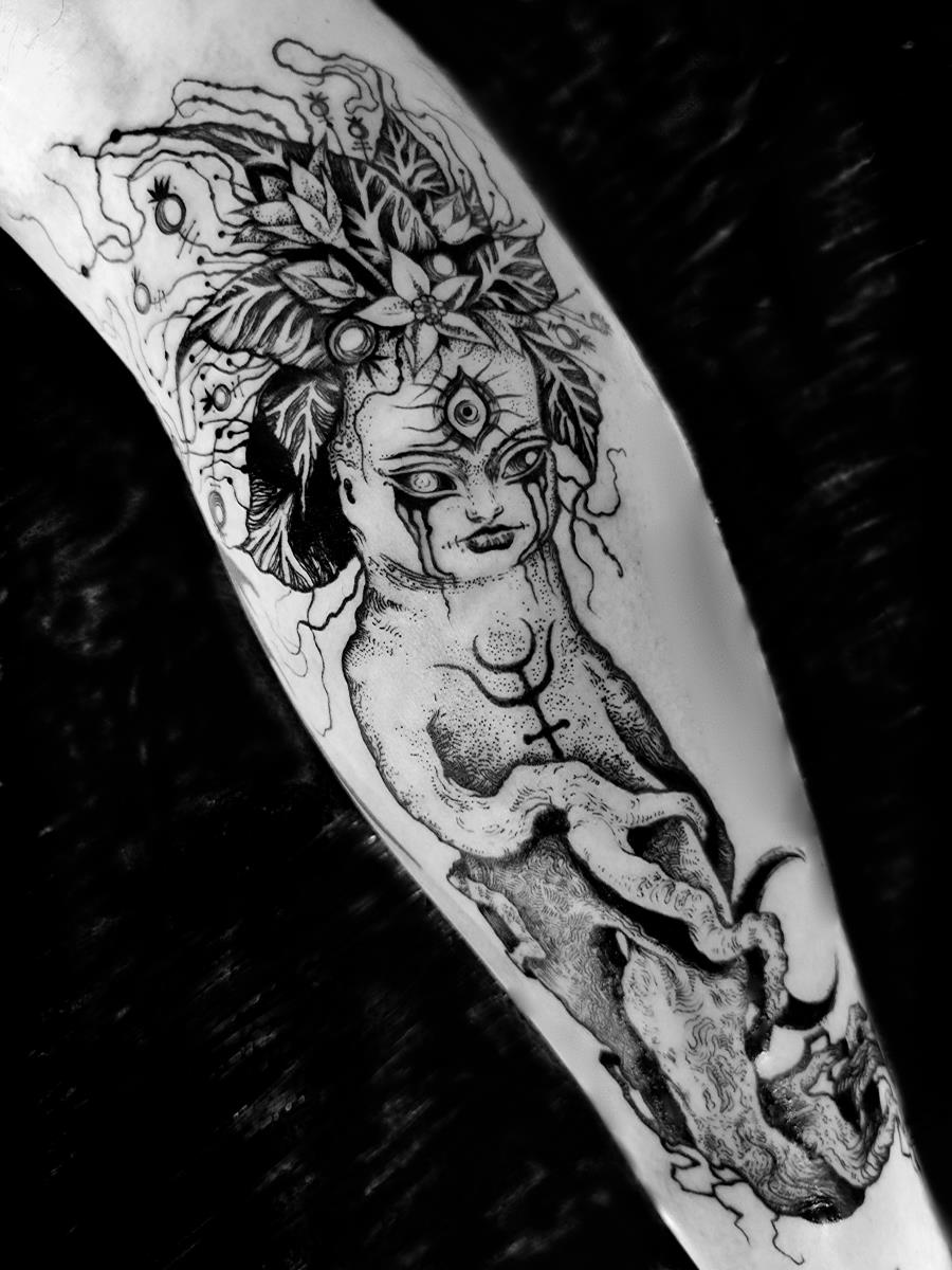 I tatuaggi vengono realizzati totalmente in bianco e nero in una personale tecnica caratterizzata dall'uso del nero puro, grandi contrasti generati da linee, segni e riempimenti graffianti e decisi. La sua passione per l'ombra, l'occulto, i segreti della psiche e il lato misterico della natura emergono nei soggetti da lei interpretati.