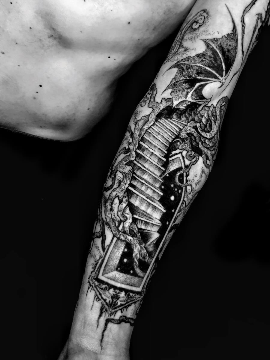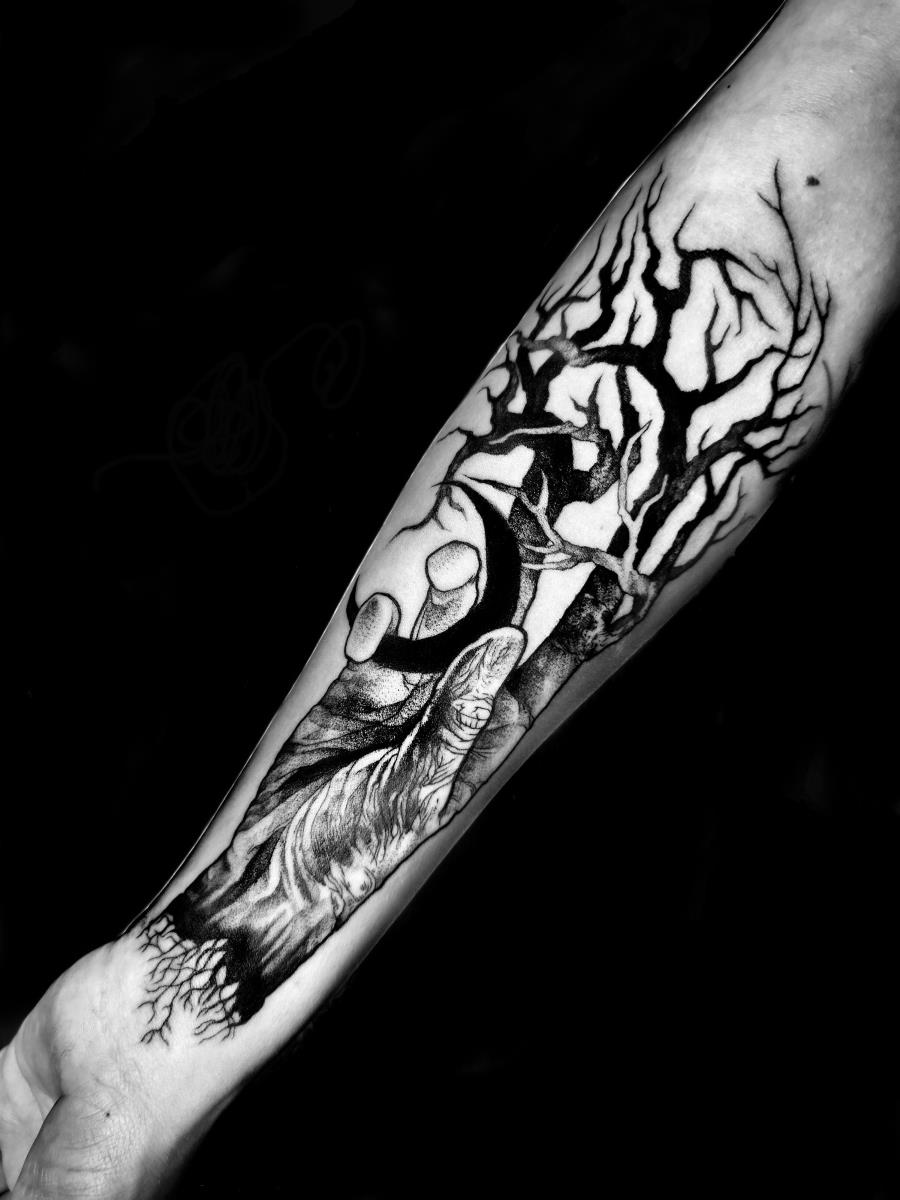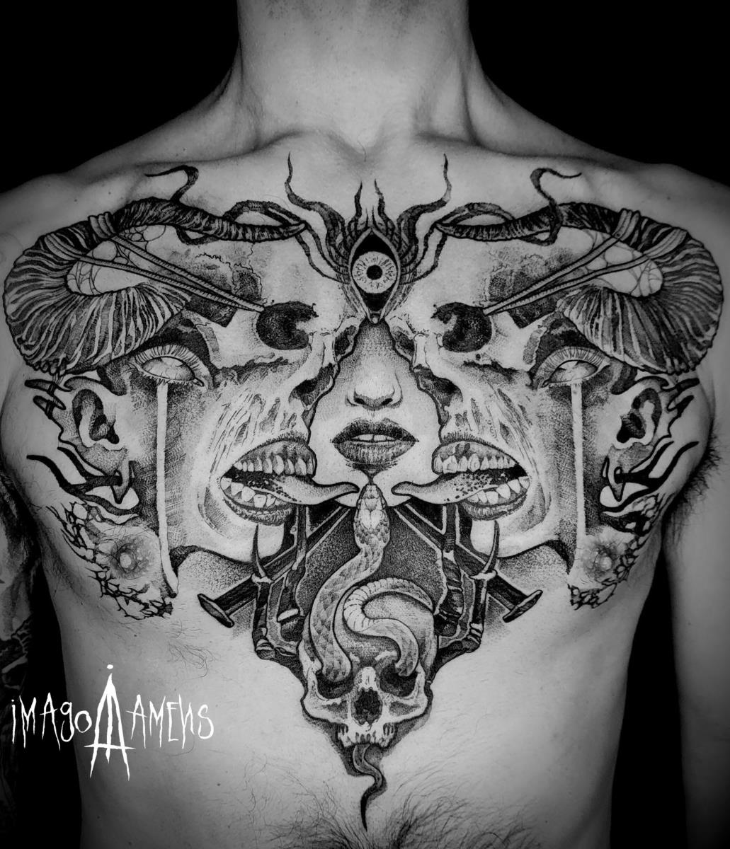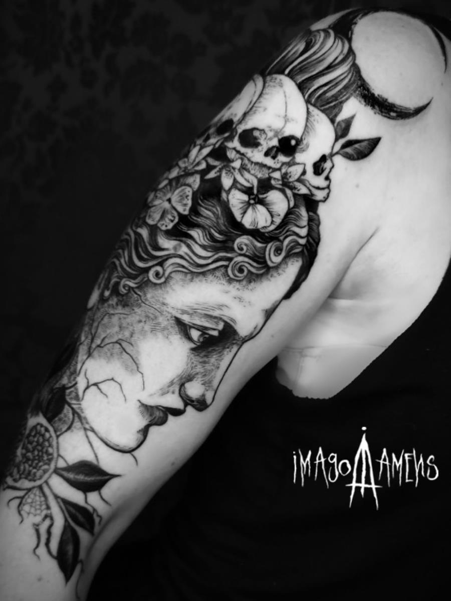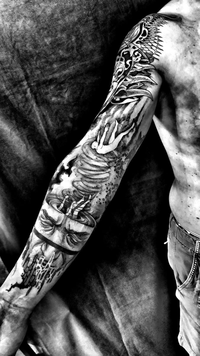 I tatuaggi vengono realizzati totalmente in bianco e nero in una personale tecnica caratterizzata dall'uso del nero puro, grandi contrasti generati da linee, segni e riempimenti graffianti e decisi. La sua passione per l'ombra, l'occulto, i segreti della psiche e il lato misterico della natura emergono nei soggetti da lei interpretati.