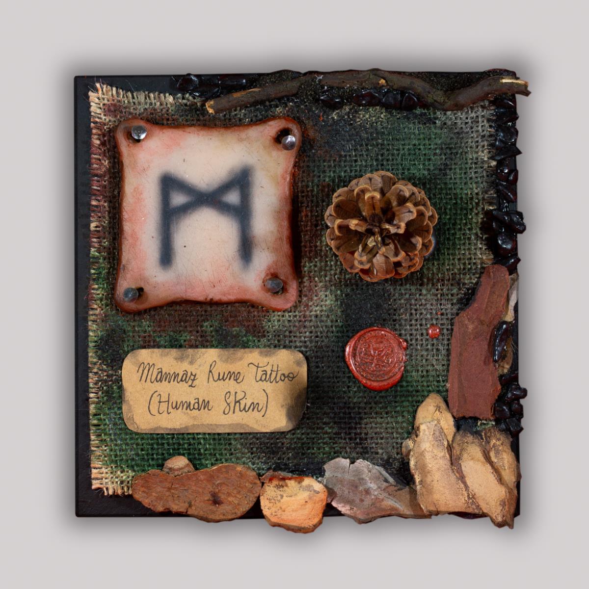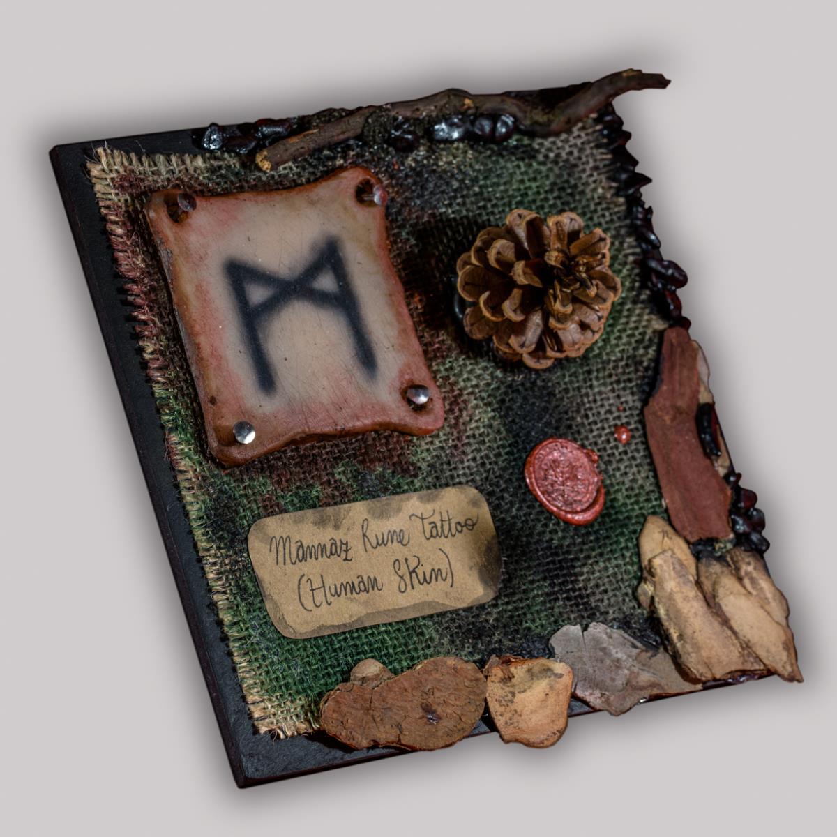 - Formato e dimensione: 30CM X 12CM - Tipo supporto: Pelle umana sintetica iper realistica (by Crisiplastica) - Tatuato a mano - Artista: Frida Ghiozzi - Titolo: Mannaz - Cornice: Legno - Su ogni quadro/oggetto è presente un’etichetta che indica titolo, data e artista dal quale è stata creata.