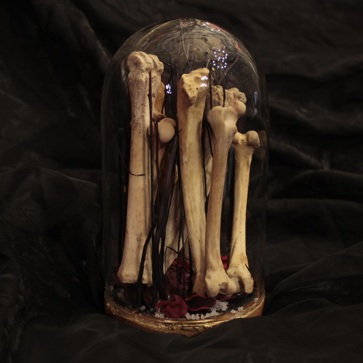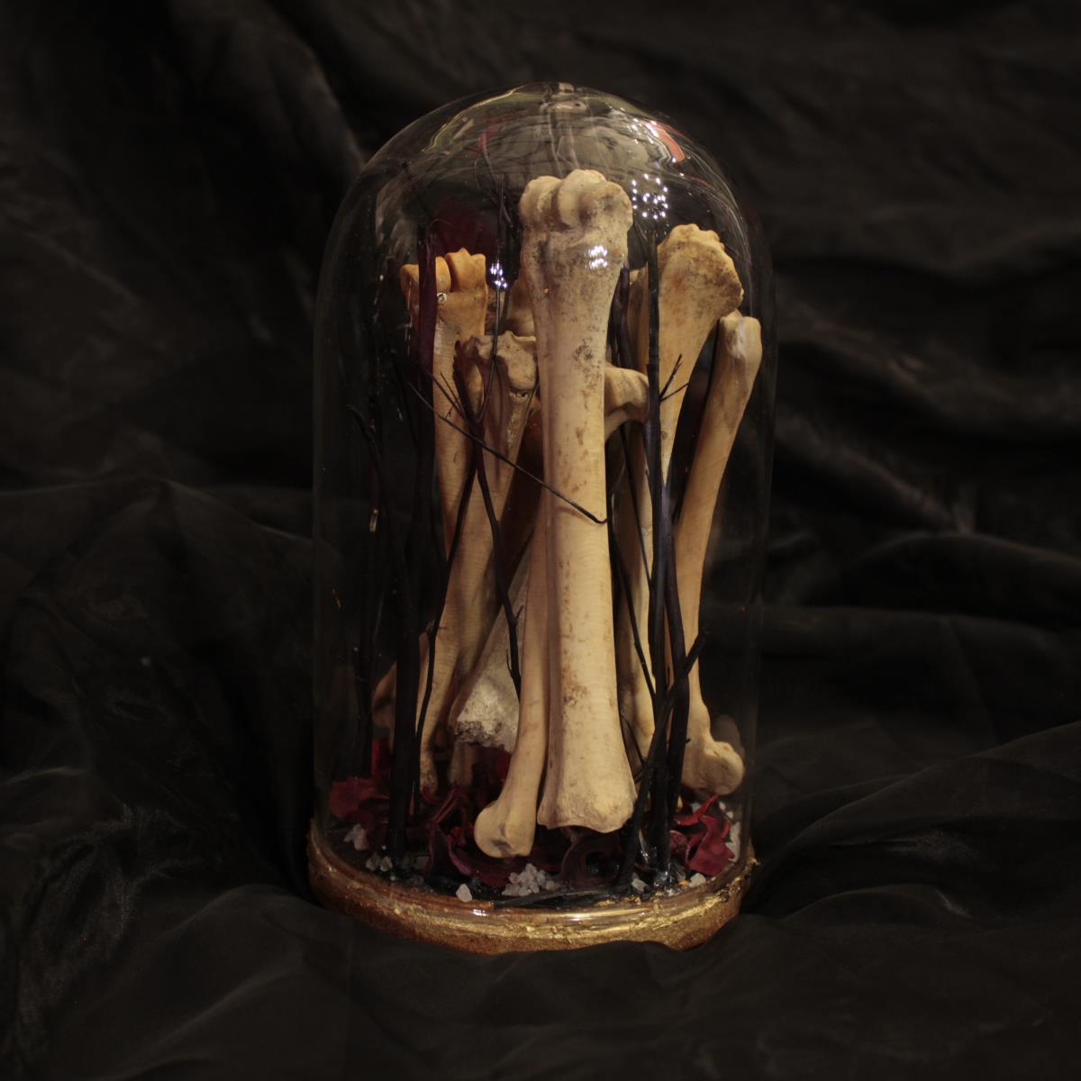 Cupola di vetro su base in legno lavorata e dipinta a mano contenente vere ossa di differenti animali selvatici (prevalentemente volpi) ritrovati in boschi e deceduti naturalmente.